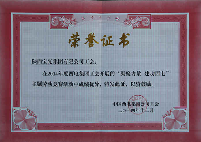 近日獲悉,在西電集團召開的“凝聚力量、建功西電”2014年度勞動競賽活動先進評選中,我公司工會等10個單位獲得西電集團工會“凝聚力量  建功西電”2014年度勞動競賽活動優秀單位,西電集團工會為我公司頒發了榮譽證書。
