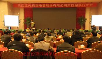 2012年12月13日,寶光股份第四屆供方大會在寶雞東高新區(qū)萬福七星國際酒店隆重召開。寶光集團(tuán)董事長、黨委書記、寶光股份總經(jīng)理李軍望,寶光股份副總經(jīng)理張軍、袁軍為,財(cái)務(wù)總監(jiān)蔣華明,及公司主要職能部門和生產(chǎn)單元相關(guān)單位領(lǐng)導(dǎo)和來自全國各地共81家的180多位供應(yīng)商代表參加了會議。大會由采購部副部長武永澤主持。