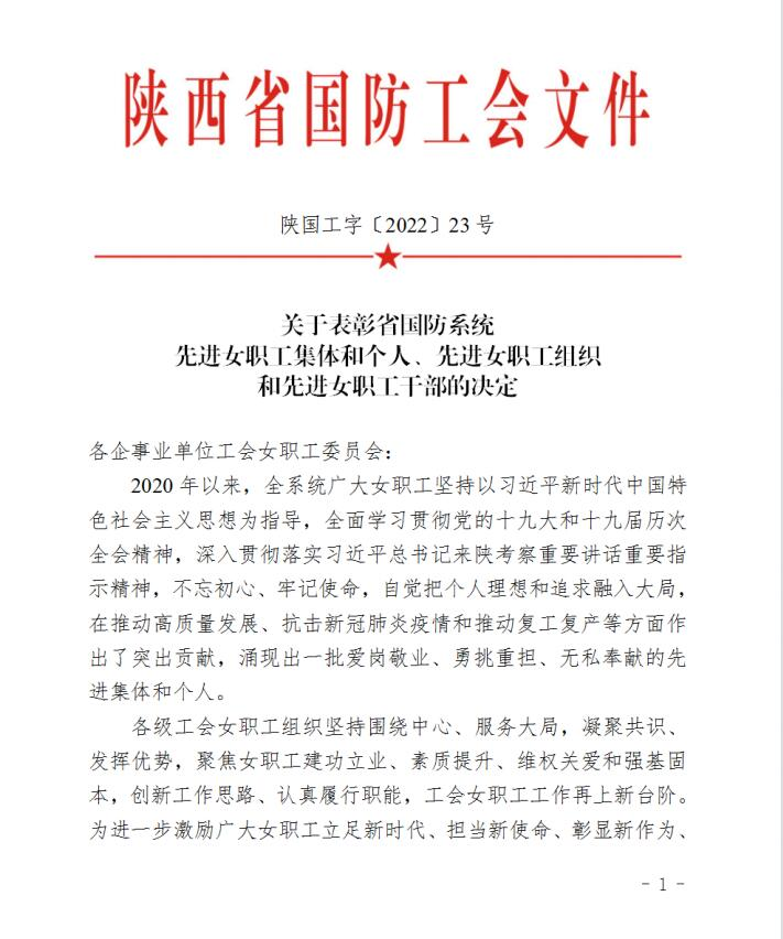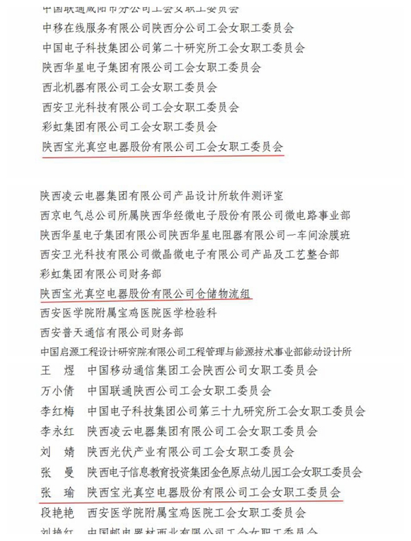 近日,從陜西省國防工會傳來喜訊,陜西寶光真空電器股份有限公司工會委員會女職工委員會被授予“陜西省國防工會先進女職工委員會”榮譽稱號,生產管理處倉儲物流組被授予“陜西省國防科技工業五一巾幗標兵崗”,工會辦公室張瑜同志被評為“陜西省國防工會先進女職工干部”榮譽稱號。