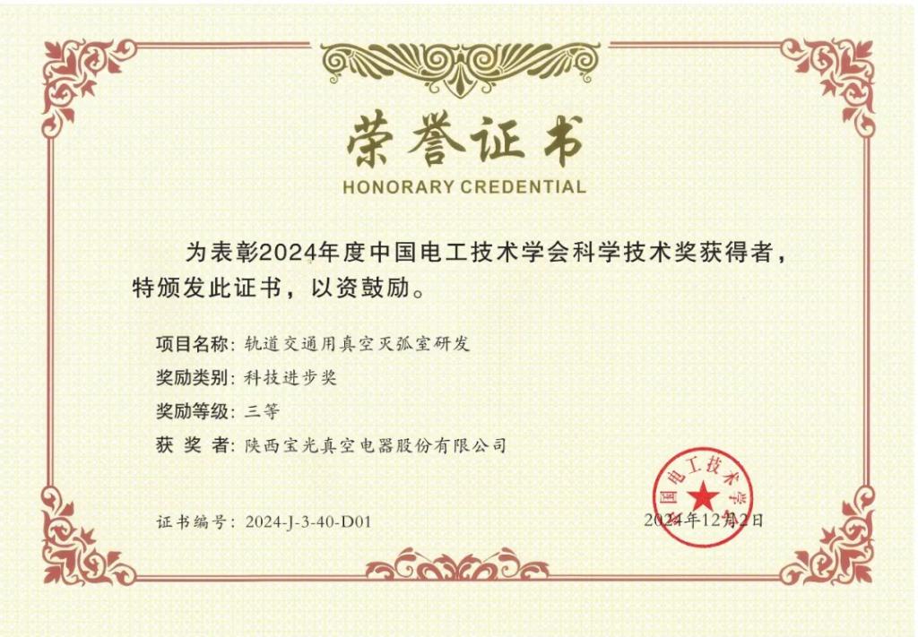 項目名稱:軌道交通用真空滅弧室研發(fā)。項目簡介:本項目研發(fā)出的BGH2570、BGH2580、BGH2590/R、BGH2530等系列化產(chǎn)品,可替代進口產(chǎn)品。4種產(chǎn)品全部通過了裝車運行驗證,部分產(chǎn)品實現(xiàn)了小批量供貨。其中BGH2570型產(chǎn)品于2023年9月通過了中國機械工業(yè)聯(lián)合會產(chǎn)品鑒定,技術水平達到國際領先。2021年至2024年累計銷量超過1000只,累計銷售額超過超過600萬元。