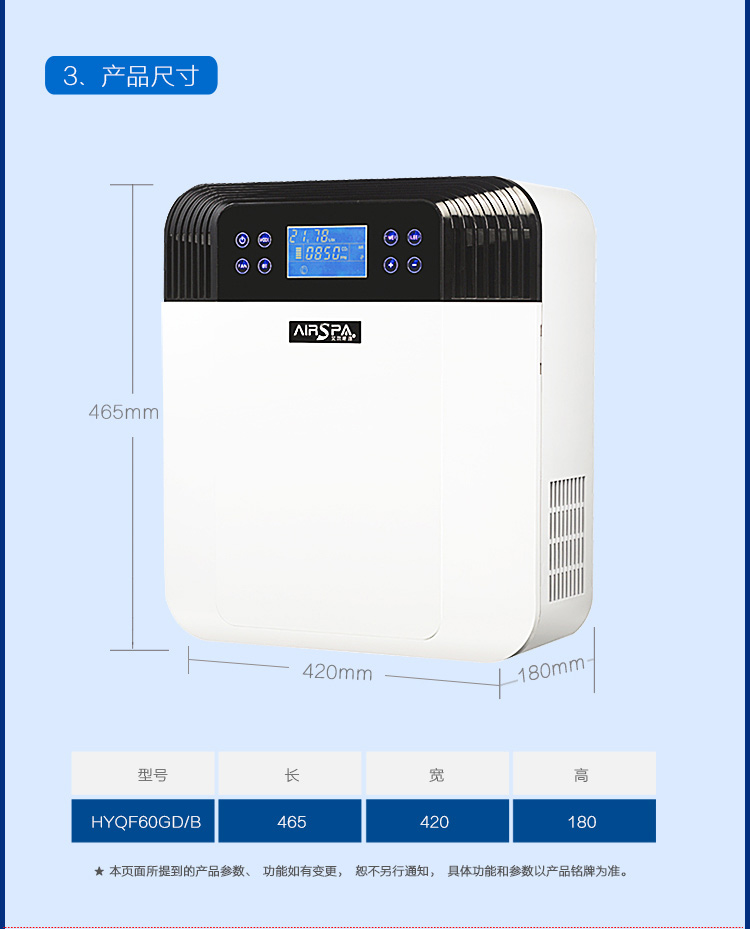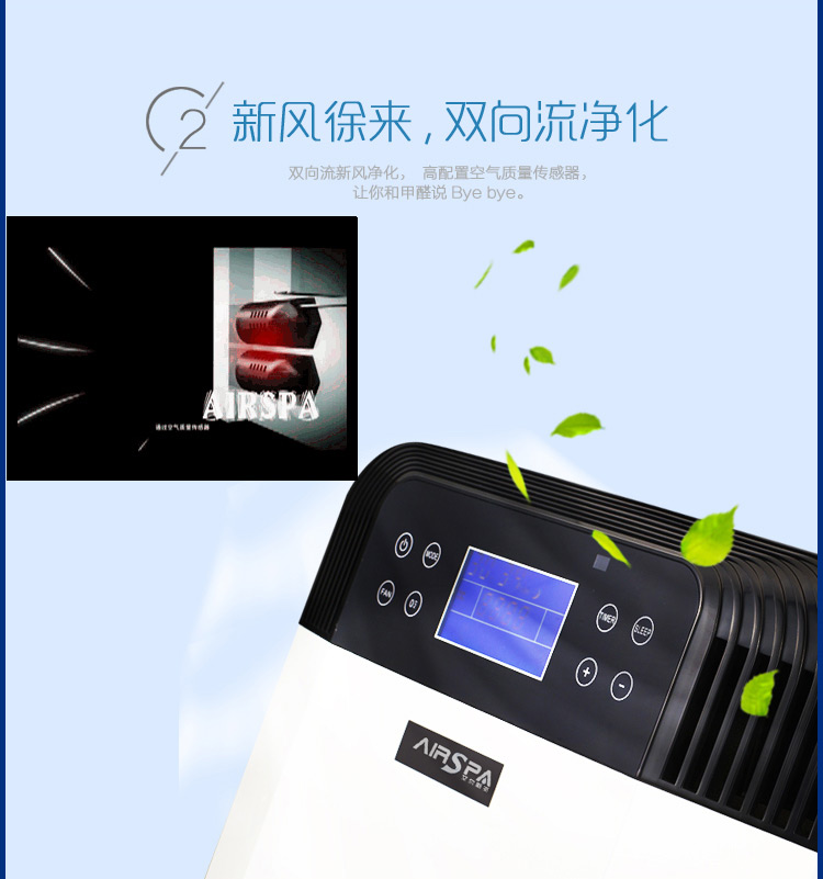 2、超大液晶顯示,自動顯示功能模式,風(fēng)量大小,室內(nèi)溫度,濕度,空氣質(zhì)量